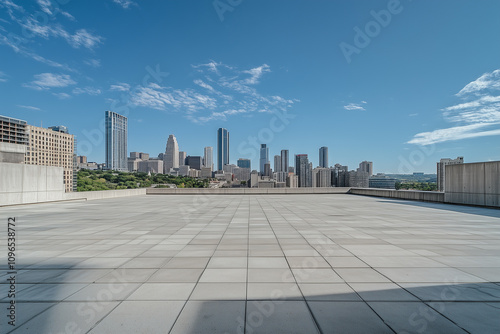rooftop, empty, city, skyline, urban, modern, architecture, skyscraper, building, foreground, open, space, concrete, floor, horizon, background, perspective, sky, blue, cloud, panoramic, downtown, office, exterior, tower, tower block, urbanisation, scene, structure, landscape, corporate, clean, roomy, minimal, outdoors, professional, environment, modernity, contemporary, futuristic, polished, design, industrial, aerial, daytime, view, open air, simplicity, abstract