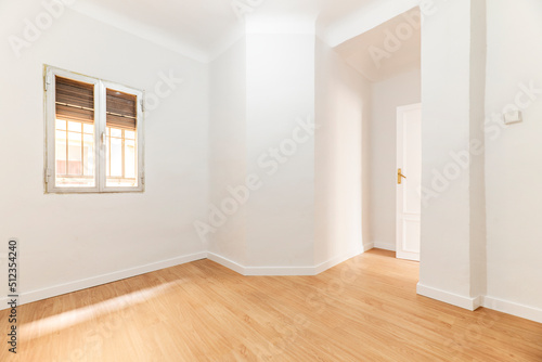 Empty room with oak parquet floor, white painted walls and aluminum windows