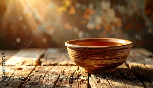 Empty rustic bowl on weathered wood table in sunlight