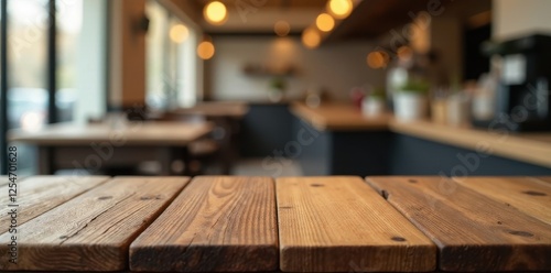 Empty rustic wooden tabletop, blurred cafe background, empty, restaurant, golden