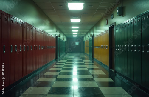 Empty school corridor with rows of colorful lockers. Checkerboard floor reflects ceiling lights. Dim lighting creates a sense of isolation and abandonment.