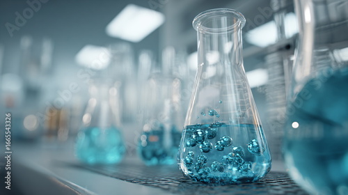 Empty science laboratory interior with various glassware and equipment. Research and development in medical, pharmaceutical, chemical industry.
