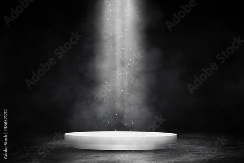 Empty space of Round white podium or pedestal in studio dark room black concrete floor grunge texture background with smoke and spotlight.