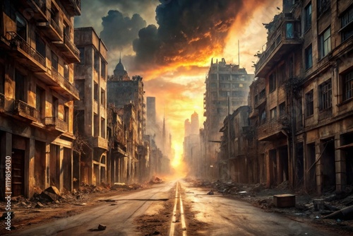 Empty street of burnt up city. Apocalyptic view of city downtown as disaster film poster concept