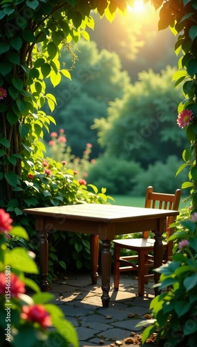 Empty table surrounded by lush garden foliage and sunlight, fresh, bright, relaxation