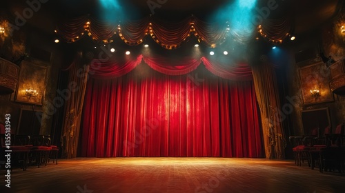 stage, theatre, curtain, red, light, spotlight, performance, show, empty, dark, wood, floor, dramatic, velvet, luxury, classic, elegant, grand, auditorium, opera, concert, play, musical, art, culture, entertainment, background, scene, setting, presentation, event, design, interior, architecture, space, room, seat, chair, ambience, atmosphere, mysterious, magic, fantasy, spectacle