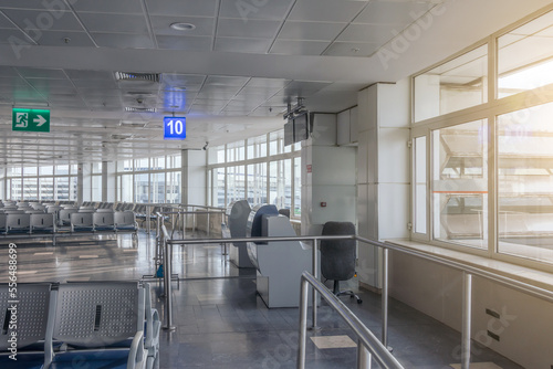 Empty waiting room in the departure lounge terminal at the airport next to the gates of the plane.
