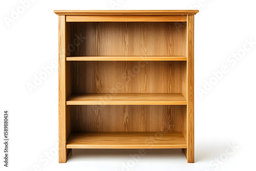 Empty wooden bookcase with three shelves isolated on white background, furniture for home storage