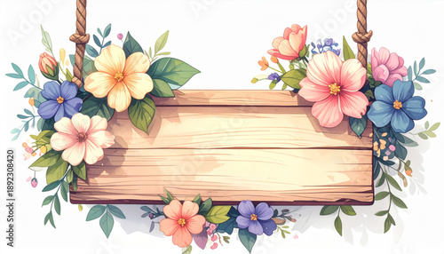 hanging, flower, spring, frame, background, copy space, board, nature, empty, plank, rope, floral, blossom, garden, summer, decoration, leaf, plant, pink, wood, texture, banner, template, announcement, cartoon, illustration, art, beautiful, fresh, season, greeting, invitation, message, billboard, rustic, vintage, watercolor, pastel, design, element, botany, bloom, bright, advertising, signpost, label, layout