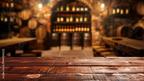 Empty wooden table in front blurred wine cellar in the background. winery and beverage concept, background for product display