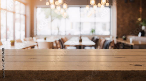 Empty wooden table top with lights bokeh on blur restaurant background.