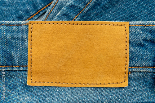 Empty worn leather patch on blue jeans. Empty space for writing. Blank leather jeans label