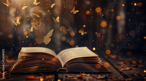 book, butterfly, open, gold, fantasy, magical, vintage, literature, story, reading, page, cognition, wisdom, enchantment, fairy tale, imagination, dream, mythical, art, artistic, illustration, abstract, inspiration, creative, retro, design, nature, leaf, wood, warm, light, glowing, sparkling, soft, rustic, romantic, gold, beautiful