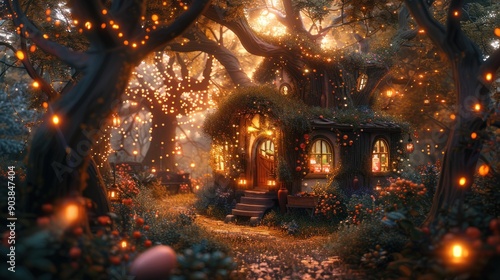 bungalow, forest, enchanted, tree, light, fairy tale, magical, fantasy, house, nature, dreamy, mystical, timberland, rustic, cosy, glowing, evening, night, warm, light, dark, green, brown, yellow, orange, gold, leaf, branch, path, step, window, door, garden, flower, bush, grass, stone, whimsical, illuminated, sparkling, atmospheric