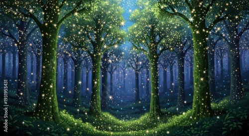 enchanted forest, magical, fantasy, glowing, sparkling, star, tree, night, whimsical, aethereal, mystical, wood, path, nature, illustration, digital artwork, dreamlike, fairy tale, wonderland, aglow, blue, green, dark, serene, mysterious, tranquil, peaceful, imaginary, fairy tale, fantastic, adventure, glow, twinkle, timberland, twilight