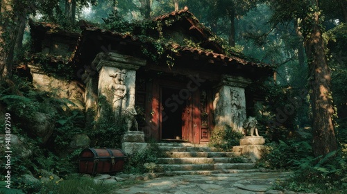 forest, retreat, ancient, architecture, nature, enchantment, mystery, stone, door, step, chest, statue, tree, greenery, moss, overgrown, rustic, fantasy, adventure, exploration, travel, history, culture, art, design, scene, environment, landscape, background, wallpaper, illustration, digital artwork, storytelling, imagination, creativity