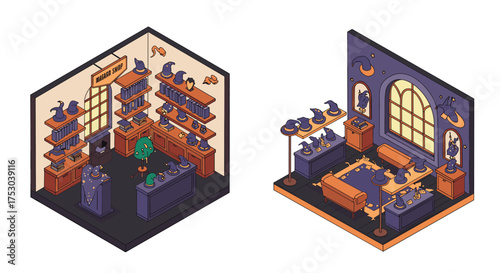 isometric, magic, shop, magician, hat, enchanted, interior, cosy, fantasy, whimsical, shelf, counter, furniture, window, display, decoration, mystical, warm, carpet, mysterious, retail, charme, decor, arrangement, shopping, merchandise, festive, scene, atmospheric
