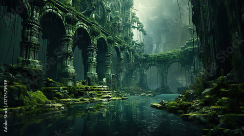 abandoned, ancient, still, path, jungle, pillar, enchanting, mystery, nature, tunnel, gloomy, arch, decay, water, greenery, forgotten, ruin, fantasy, ruined, stone, moss, dark, swamp