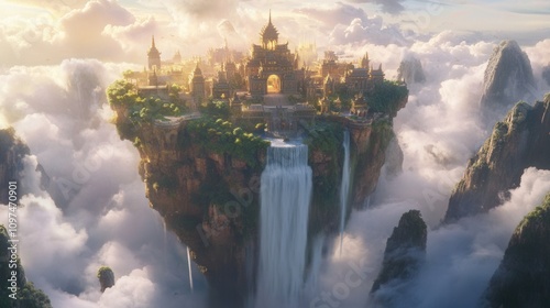 waterfall, cloud, aerial view, surreal, panoramic view, scenic, beautiful, majestic, serene, peaceful, tranquil, nature, digital artwork, illustration, artwork, golden hour, sunlight, dramatic sky, cloudscape, mountain chain, cliff, rock formation, vegetation, heaven, paradise, utopia, mystical, ancient city, unexplored, adventure