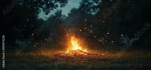 Enchanting Bonfire Night Scene: A Gathering Under the Twilight Sky with Glowing Embers