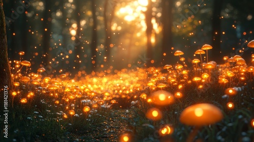 Enchanting forest pathway illuminated by glowing mushrooms at sunset