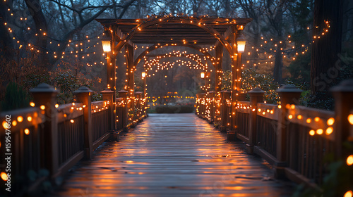 Enchanting Pathway of Lights Romantic Wooden Bridge Adorned with Fairy Lights at Night
