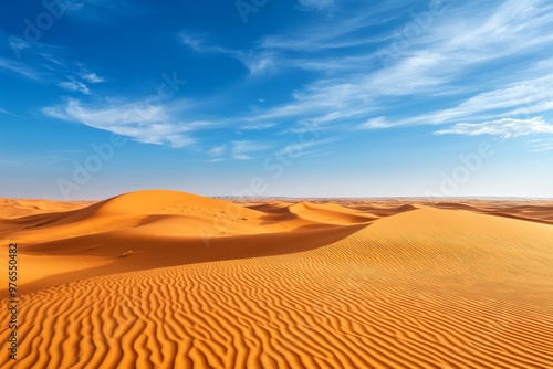 Endless golden dunes extend across the vast desert landscape, under a serene blue sky with wispy clouds, symbolizing beauty, tranquility, expanse, nature, and adventure.