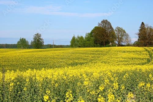 Endless rapeseed fields bloomed with beautiful yellow flowers on warm May days