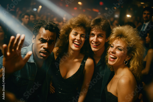 Energetic 1980s nightclub party filled with people in vintage outfits, bold hairstyles, and retro accessories celebrating with pure joy and nostalgic euphoria.