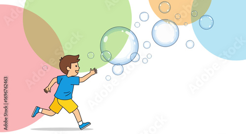 Energetic Boy Chasing Bubbles With Joyful Expression Against Colorful Background