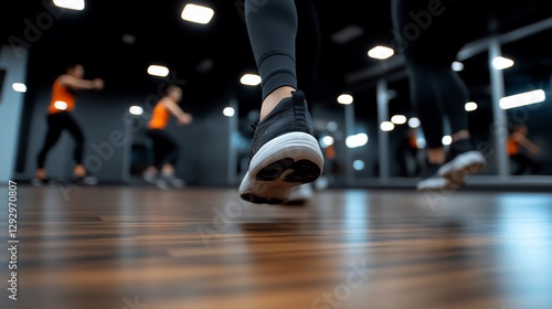 fitness, physical exercise, exercise, gym, training, class, group, active, healthy, lifestyle, sport, athletic, energy, intensity, motion, movement, leg, foot, shoe, sneaker, floor, wood, dark, light, people, woman, instructor, participant, blurred, background, sharpened, closeup, perspective, dynamic, action, health, wellness, body, strength, cardio