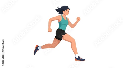 Energetic woman sprinting forward in a dynamic pose. She is dressed in athletic gear, showcasing speed and determination
