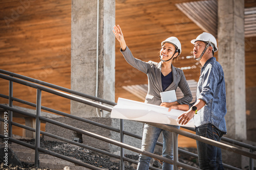 Engineer and business woman in hardhat posing on building site. civil engineer or architect with hardhat on construction site checking schedule on plan.