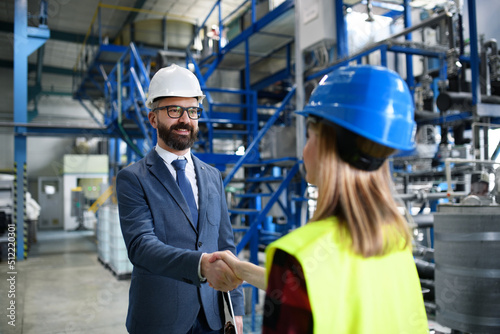 Engineer and industrial worker in uniform shaking hands in large metal factory hall and talking.