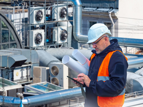 Engineer in safety gear with blueprints and tablet inspects rooftop HVAC and ventilation systems, ensuring technical compliance and maintenance. Construction, HVAC, Engineering, Inspection.