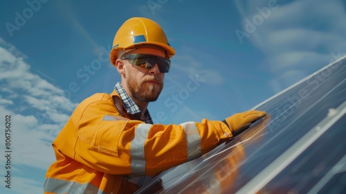 Engineer installing photovoltaic panels in a solar farm, harnessing renewable energy for sustainable power generation.