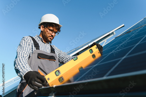 arab, men at work, tool, installing, solar, panel, panel, installation, engineer, level, tool, sustainable, energy, renewable, rooftop, construction, maintenance, technology, environment, clean, electrician, power, electricity, photovoltaic, alternative, green, eco, friendly, sustainability, climate, change, efficiency, conservation, building, industry, professional, occupation, job, helmet, safety, equipment, measuring, precision, accuracy, sunlight, blue, sky, sunny, outdoors