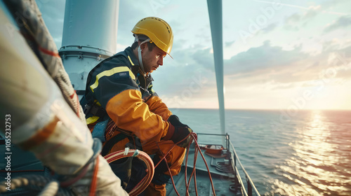 Engineer man maintains a windmill turbine on the open sea. Green energy and technology concept. AI-generated.
