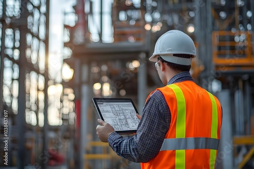 construction, engineer, safety, hard hat, vest, tablet, technology, machinery, building, site, plan, project, infrastructure, industry, men at work, tool, equipment, review, blueprint, urban, development, scaffold, inspection, structure, architecture, construction site, contractor, foreman, oversight, progress, coordination, design, render, digital, mobile, communication