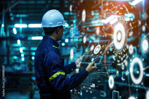 Engineer using data and control networking for clean energy industry, development, energy saving. Smart industry 4.0 technology concept