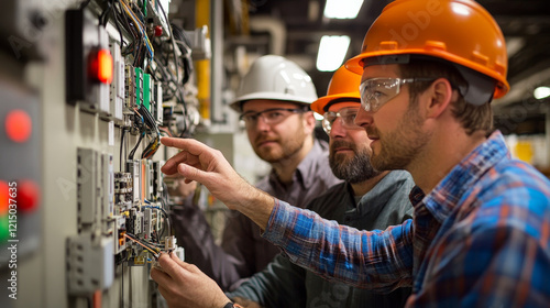 collaboration, wiring, factory, teamwork, electrical, safety, helmet, machinery, technology, circuit, professional, industrial, maintenance, equipment, problem solving, tool, control, panel, work, environment, communication, planning, design, installation, troubleshooting, system, project, innovation, skilled, analysis, workshop, training, construction, precision, sharpened, industry, technical, expertise, engineering, board, assembly, hardware, connection, infrastructure, setting, operational, efficiency