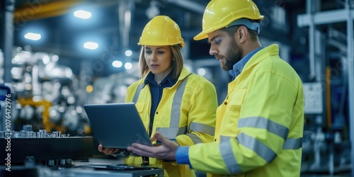 Engineers in Yellow Jackets Reviewing Production Data. Two engineers in yellow safety jackets examine production data on a laptop, working together in a large industrial facility.