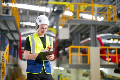 Engineers inspecting locomotive in railway engineering facility