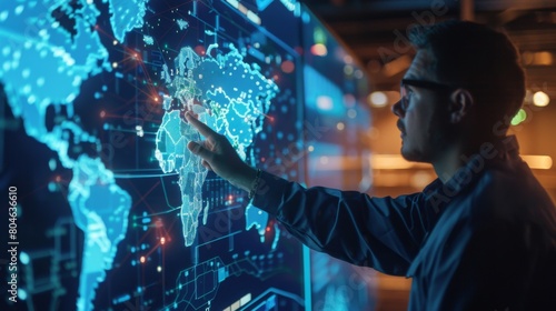 Engineers pointing virtual interface panel of global logistics network distribution and transportation, Smart logistics, Import export and industry,