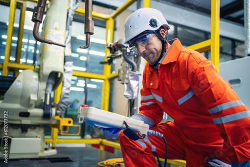 Engineers team mechanic using computer controller Robotic arm for welding steel in steel factory workshop. Industry robot programming software for automated manufacturing technology