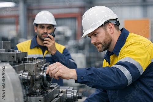 factory, engineer, machine, industrial, conveyer, line, concept, teamwork, men at work, production, equipment, mechanic, inspection, gear, automation, manufacturing, precision, tool, maintenance, control, operator, safety, hard hat, uniform, metal, machinery, technician, workplace, labor, plant, assembly, adjustment, setup, industry, professional, supervisor, communication, coordination, process, sharpened, team, technology, steel, accuracy, efficiency, system, ai, generative, illustration