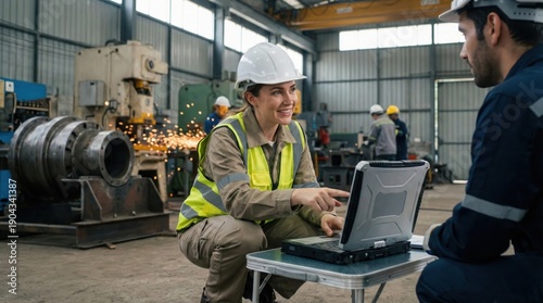 industrial, laptop, work, factory, warehouse, construction, men at work, teamwork, industry, technology, business, professional, man, woman, people, working, communication, collaboration, computer
