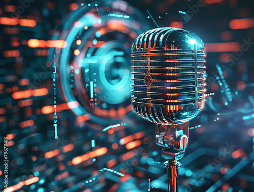 Enhance the image quality and show more details. Make the microphone look more realistic and three-dimensional. Add more details to the background and make it look more futuristic.