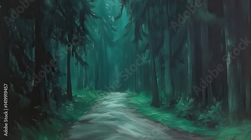 forest, road, path, green, dark, tree, landscape, nature, wood, light, mist, atmosphere, mystery, scenic, depth, perspective, painting, artwork, art, canvas, texture, shadow, mood, eerie, tranquil, serene, solitude, isolation, travel, journey, exploration, timberland, foliage, greenery, wilderness, silence, stillness, environment, obscurity, distance, fog, adventure, beauty, aethereal, surreal, dreamlike, quiet, peaceful, calm