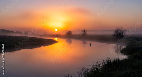 sunrise, river, mist, fog, landscape, dawn, water, nature, morning, peaceful, serene, tranquil, aethereal, sunlight, scenic, horizon, beauty, sky, gold, light, calm, cloud, outdoors, environment, relaxation, nobody, tree, plant, silhouette, kayak, adventure, sport, recreation, paddling, vacation, tour tourism, travel, exploration, wilderness, quiet, mystic, dreamy, magical, vibrant